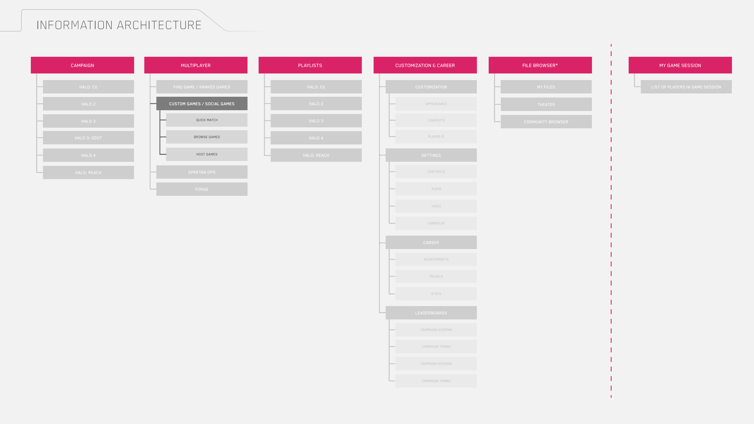 After learning about the goals for Custom Browser, the discovery phase of this feature entailed competitive analysis (how did other social games such as Counter-strike: Source handle public lobby browsers?), reviewing requests on 343’s forums, and conducting and empathizing with players during user research listening sessions.